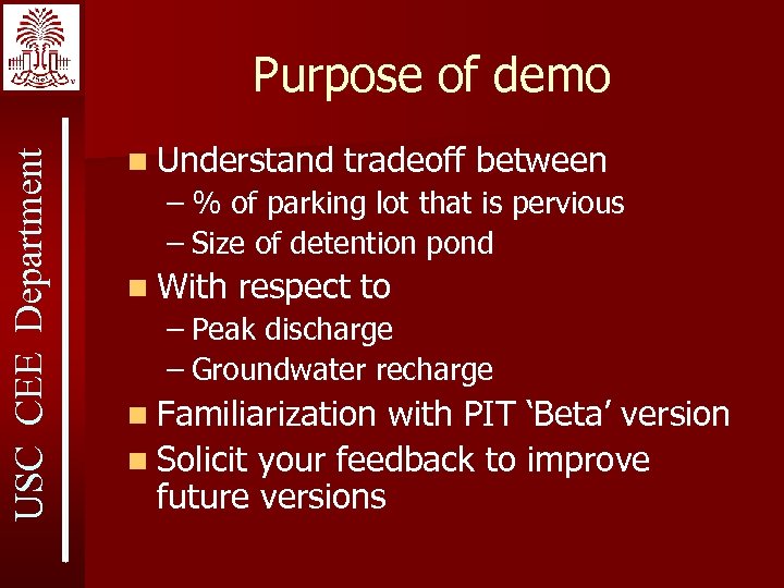 USC CEE Department Purpose of demo n Understand tradeoff between – % of parking lot that is pervious – Size of detention pond n With respect to – Peak discharge – Groundwater recharge n Familiarization with PIT ‘Beta’ version n Solicit your feedback to improve future versions