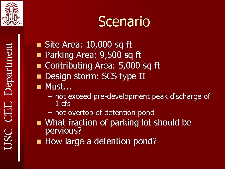 USC CEE Department Scenario n n n Site Area: 10, 000 sq ft Parking Area: 9, 500 sq ft Contributing Area: 5, 000 sq ft Design storm: SCS type II Must. . . – not exceed pre-development peak discharge of 1 cfs – not overtop of detention pond What fraction of parking lot should be pervious? n How large a detention pond? n
