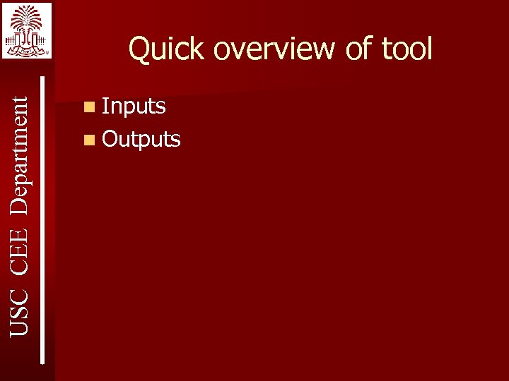 USC CEE Department Quick overview of tool n Inputs n Outputs