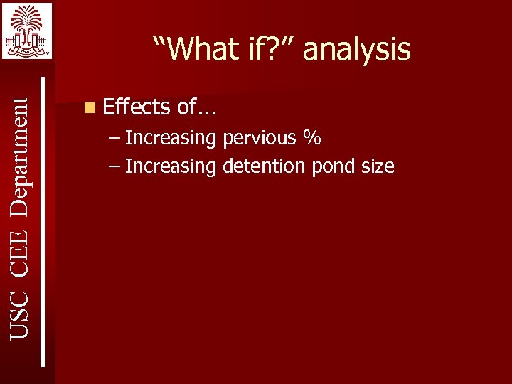 USC CEE Department “What if? ” analysis n Effects of. . . – Increasing pervious % – Increasing detention pond size