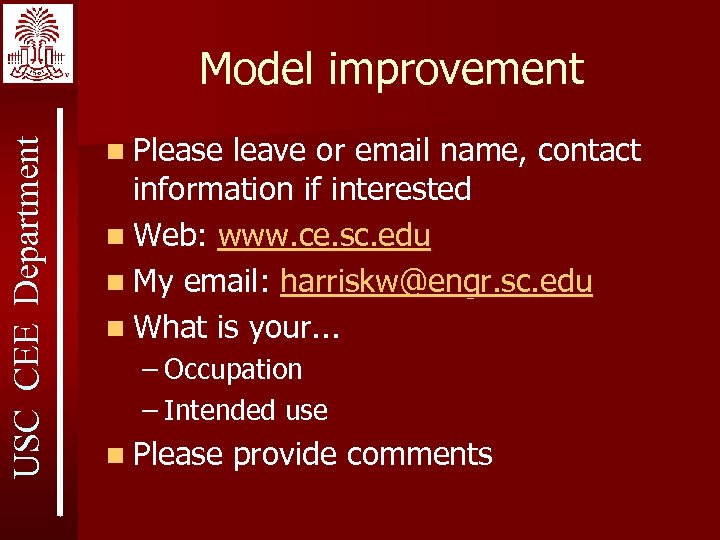 USC CEE Department Model improvement n Please leave or email name, contact information if interested n Web: www. ce. sc. edu n My email: harriskw@engr. sc. edu n What is your. . . – Occupation – Intended use n Please provide comments