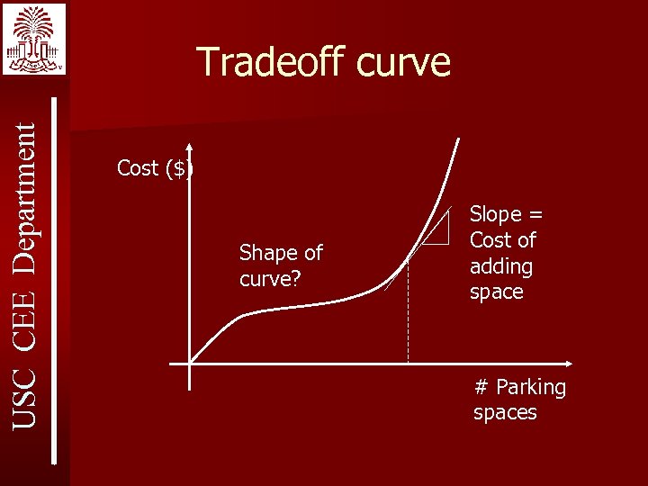 USC CEE Department Tradeoff curve Cost ($) Shape of curve? Slope = Cost of adding space # Parking spaces