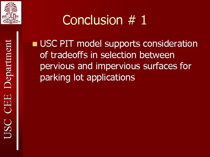 USC CEE Department Conclusion # 1 n USC PIT model supports consideration of tradeoffs in selection between pervious and impervious surfaces for parking lot applications