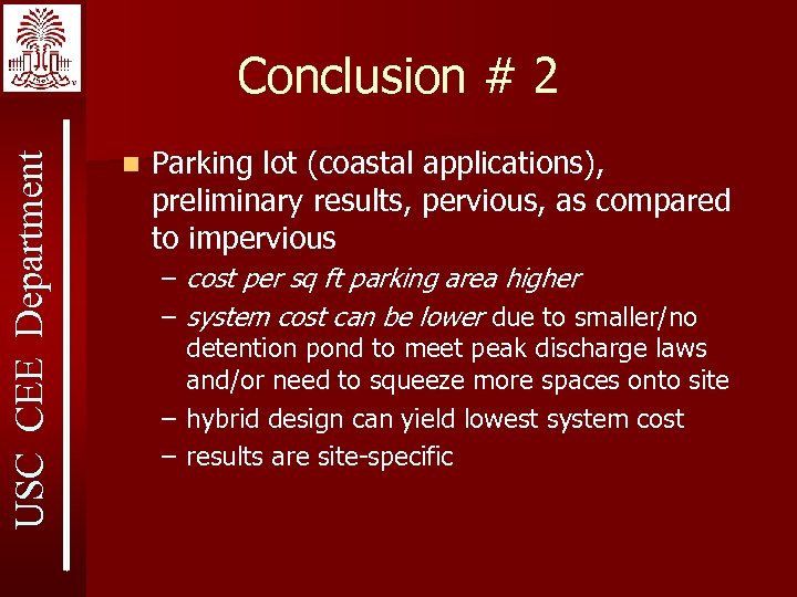 USC CEE Department Conclusion # 2 n Parking lot (coastal applications), preliminary results, pervious, as compared to impervious – cost per sq ft parking area higher – system cost can be lower due to smaller/no detention pond to meet peak discharge laws and/or need to squeeze more spaces onto site – hybrid design can yield lowest system cost – results are site-specific