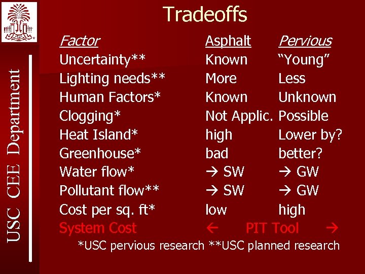 Tradeoffs USC CEE Department Factor Uncertainty** Lighting needs** Human Factors* Clogging* Heat Island* Greenhouse* Water flow* Pollutant flow** Cost per sq. ft* System Cost Asphalt Pervious Known “Young” More Less Known Unknown Not Applic. Possible high Lower by? bad better? SW GW low high PIT Tool *USC pervious research **USC planned research