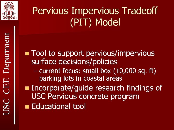 USC CEE Department Pervious Impervious Tradeoff (PIT) Model n Tool to support pervious/impervious surface decisions/policies – current focus: small box (10, 000 sq. ft) parking lots in coastal areas n Incorporate/guide research findings of USC Pervious concrete program n Educational tool
