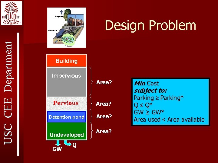 USC CEE Department Design Problem Building Impervious Area? Pervious Area? Detention pond Area? Undeveloped GW Q Area? Min Cost subject to: Parking* Q Q* GW ≥ GW* Area used Area available