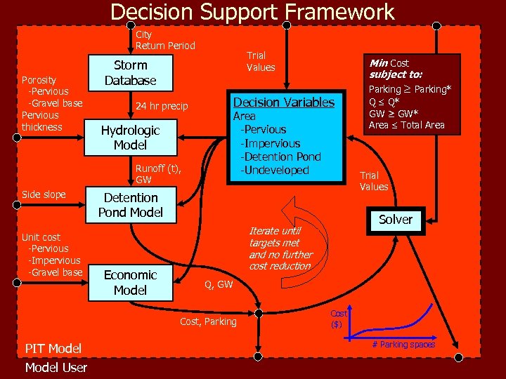 Decision Support Framework City Return Period Porosity -Pervious -Gravel base Pervious thickness Trial Values Storm Database Decision Variables 24 hr precip Area -Pervious -Impervious -Detention Pond -Undeveloped Hydrologic Model Runoff (t), GW Side slope Unit cost -Pervious -Impervious -Gravel base Economic Model Parking* Q Q* GW ≥ GW* Area Total Area Trial Values Detention Pond Model Solver Iterate until targets met and no further cost reduction Q, GW Cost, Parking PIT Model User Min Cost subject to: Cost ($) # Parking spaces