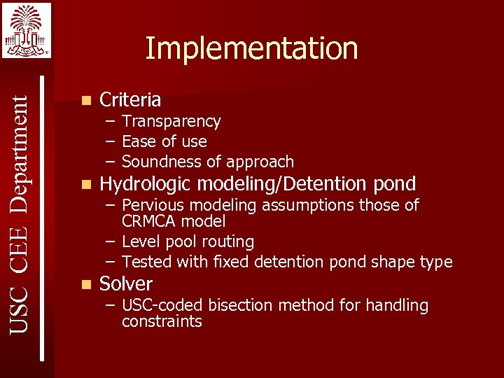 USC CEE Department Implementation n Criteria n Hydrologic modeling/Detention pond n Solver – Transparency – Ease of use – Soundness of approach – Pervious modeling assumptions those of CRMCA model – Level pool routing – Tested with fixed detention pond shape type – USC-coded bisection method for handling constraints