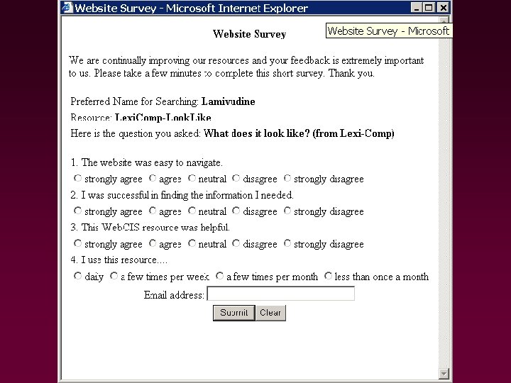 Evaluation • Log file analysis: 32 months of data • On-line survey: 108 comments • Popup questionnaires: 195/~3, 642 (5. 4%) • E-mail survey