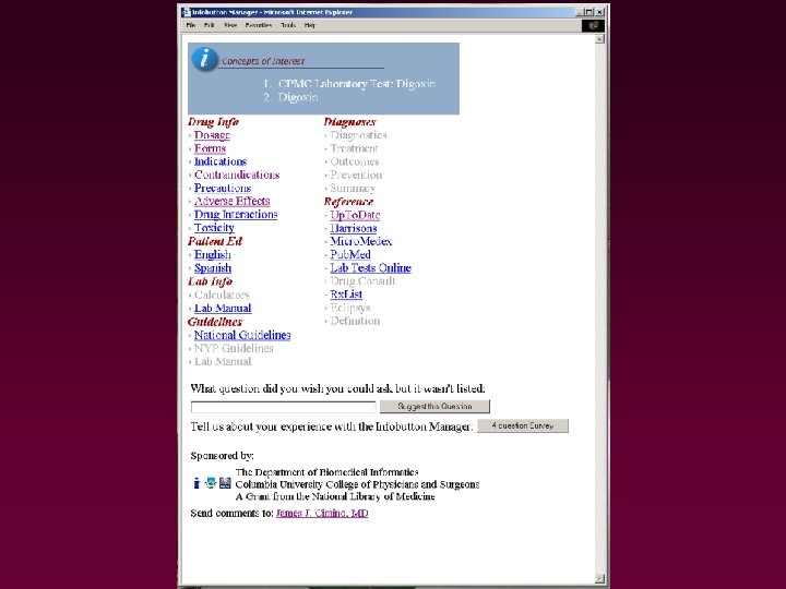 Use, Usability, Usefulness and Impact of an Infobutton Manager James J. Cimino, M. D. Department of Biomedical Informatics Columbia University College of Physicians and Surgeons 2006 AMIA Fall Symposium