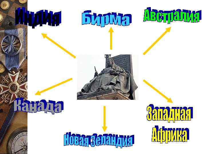 Канада, Австралия, Новая Зеландия – доминионы Англии. Доминион (англ. - владение) – это территория в составе Британской империи, обладающая правом самоуправления и признающая власть английского монарха.