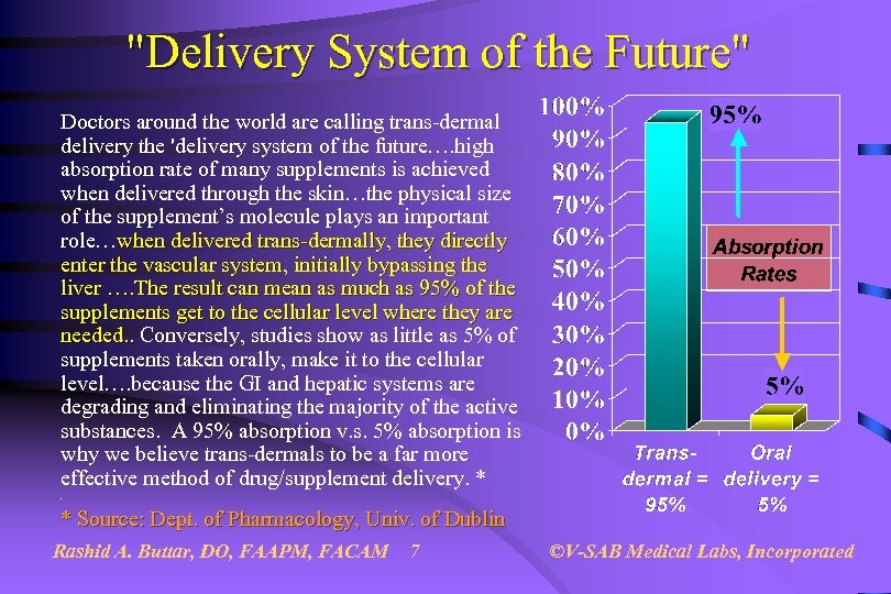 "Delivery System of the Future" Doctors around the world are calling trans-dermal delivery the 'delivery system of the future…. high absorption rate of many supplements is achieved when delivered through the skin…the physical size of the supplement’s molecule plays an important role…when delivered trans-dermally, they directly enter the vascular system, initially bypassing the liver …. The result can mean as much as 95% of the supplements get to the cellular level where they are needed. . Conversely, studies show as little as 5% of supplements taken orally, make it to the cellular level…. because the GI and hepatic systems are degrading and eliminating the majority of the active substances. A 95% absorption v. s. 5% absorption is why we believe trans-dermals to be a far more effective method of drug/supplement delivery. *. * Source: Dept. of Pharmacology, Univ. of Dublin Rashid A. Buttar, DO, FAAPM, FACAM 7 ©V-SAB Medical Labs, Incorporated