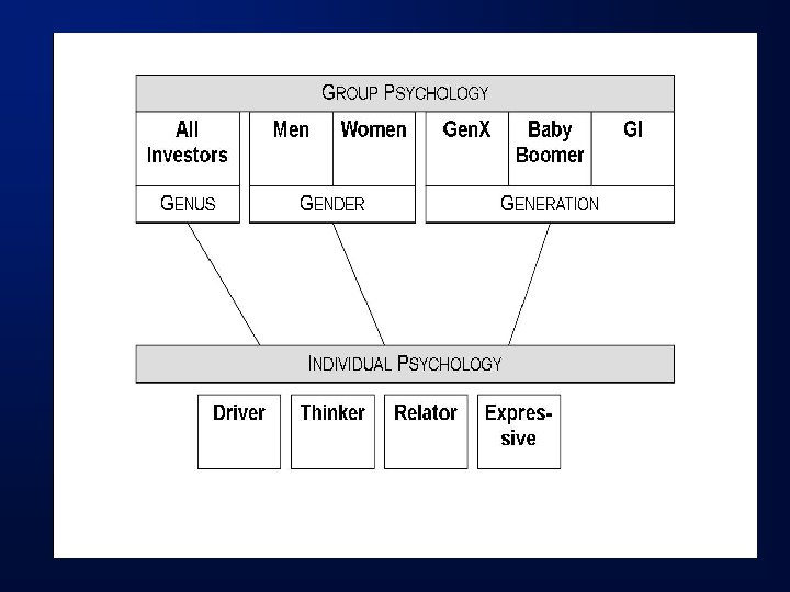 Two paths into the Psyche of the Investor 1. Group (G-Factors) 1. 2. 3. 4. 5. Genus (common to all humans) Gender (Males vs. females) Generation (Gen. X, Baby Boomer, GI Gen) Geography (where you grew up, live now) Guild (vocation or profession) 2. Individual (I-Factors) 1. 2. 3. Personality Mental Filters Values & Criteria