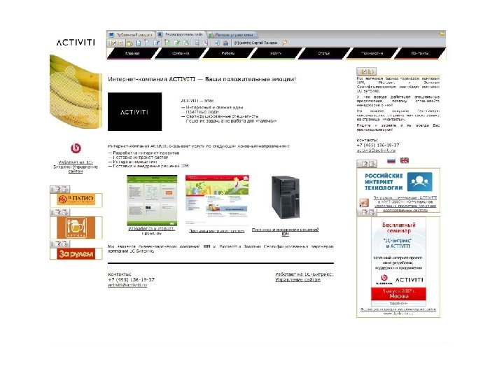 Этапы разработки сайта – – – – Анализ задачи, формирование требований Проектирование Дизайн Интеграция Реализация нестандартного функционала Наполнение информацией Тестирование и доводка Сдача проекта Сергей Панарин, генеральный директор Интернет-компании ACTIVITI, www. activiti. ru