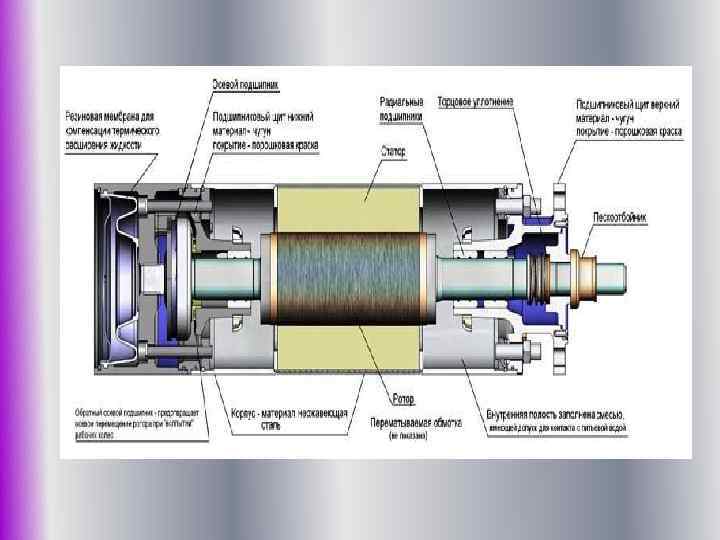• Компенсация изменения объема жидкости, заполняющей двигатель, осуществляется конструкцией насоса. Электродвигатели серий ПЭДВ-219, ПЭДВ-180, ДПТВ 12 состоят из ротора, статора, щитов подшипниковых (верхнего и нижнего), радиальных резинометаллических подшипников, пяты (узел упорного подшипника), подпятника, днища. Герметизация двигателей осуществляется посредством резиновых колец. Статор представляет собой трубу, в которую запрессован сердечник, набранный из листов стали. В пазы сердечника уложена обмотка, выполненная проводом с полиэтиленовой водостойкой изоляцией, допускающей длительную работу в воде. Ротор состоит из вала, сердечника ротора. Сердечник собран из листов, штампованных из электротехнической стали. Обмотка ротора короткозамкнутая, выполнена путем заливки пазов сердечника алюминием. С двух сторон сердечника на вал установлены кольца.