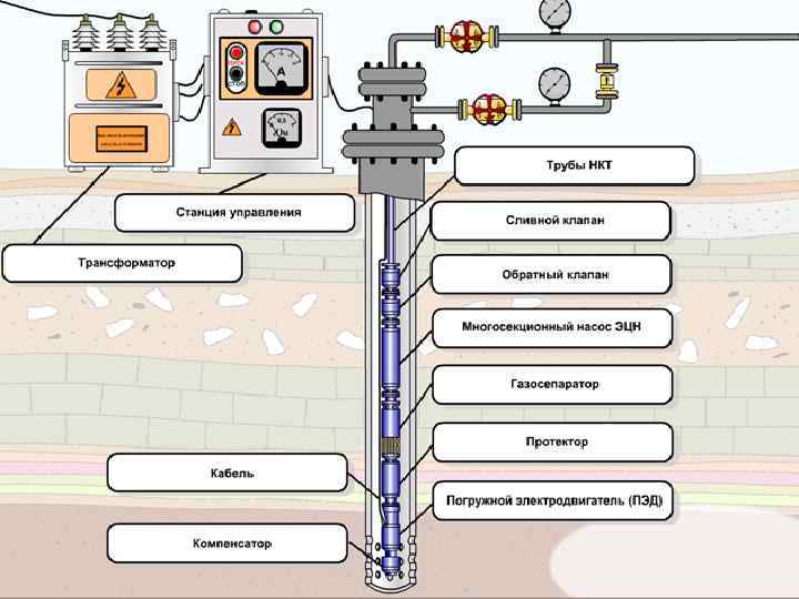ОБОРУДОВАНИЕ УЭЦН: • Наземное (устьевая арматура, станция управления работой скважинной установки и трансформатор напряжения) • Подземное оборудование (НКТ, сливной и обратный клапана, кабель, электроцентробежный насос, газосепаратор, протектор, погружной электродвигатель, компенсатор, высокоточная система погружной телеметрии)