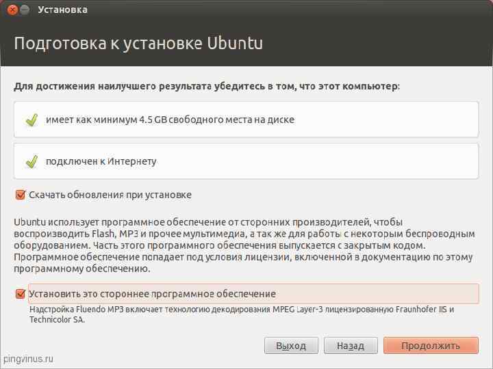 На следующем окне «Подготовка к установке Ubuntu» вам предлагается установить две галочки «Скачать обновления при установке» и «Установить это стороннее программное обеспечение» . Если вы установите опцию «Скачать обновления при установке» , тогда во время установки все свежие обновления будут автоматически загружены из интернета и установлены (а также файлы локализации). Отметим, что в данном случае установка будет идти дольше. Если у вас сейчас нет подключения к интернет, то вы сможете обновить систему уже после установки. Вторая опция (галочка) означает то, что вы согласны с тем, что будут установлены некоторые компоненты с закрытым исходным кодом (например MP 3 кодеки и FLASH). Советуем поставить две галочки, далее нажимаем кнопку Продолжить.