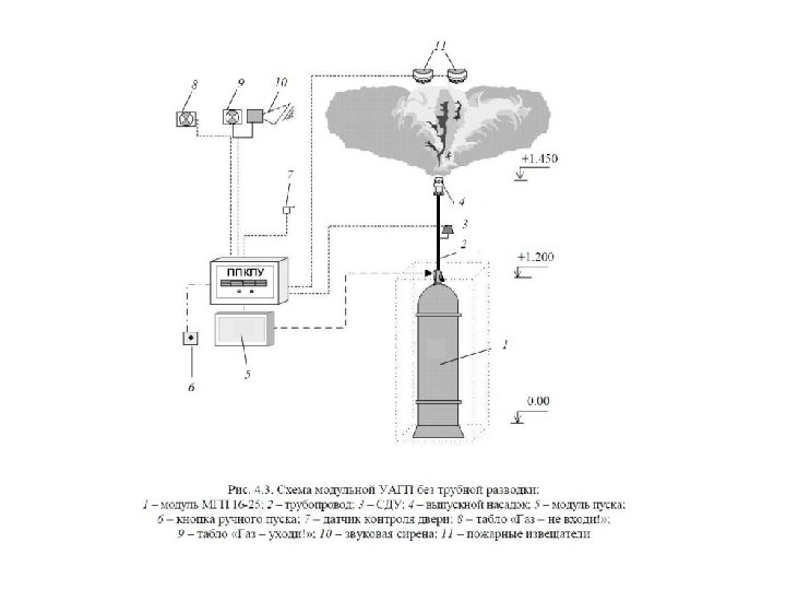 [1, с. 208] 12. 4 АУГП-АУПП. Требования к сигнализации 12. 4. 1 Кроме общих требований… должна обеспечивать: а) дистанционный пуск установки; б) автоматический контроль: - линий управления ЗПУ на обрыв; - давления в пусковых баллонах и побудительном трубопроводе для АУГП; в) задержку выпуска ОТВ не менее чем на 10 с; г) отключение автоматического пуска при открывании дверей в помещение с индикацией отключения. 12. 4. 3 При открывании дверей – сигнализация об отключение автоматического пуска. Устройствами отключения автоматического пуска АУПТ допускается не оборудовать помещения: - объемом не более 100 м 3 - без постоянного пребывания людей; - с пожарной нагрузкой не более 1000 МДж/м 2, а также электрошкафы и кабельные сооружения.