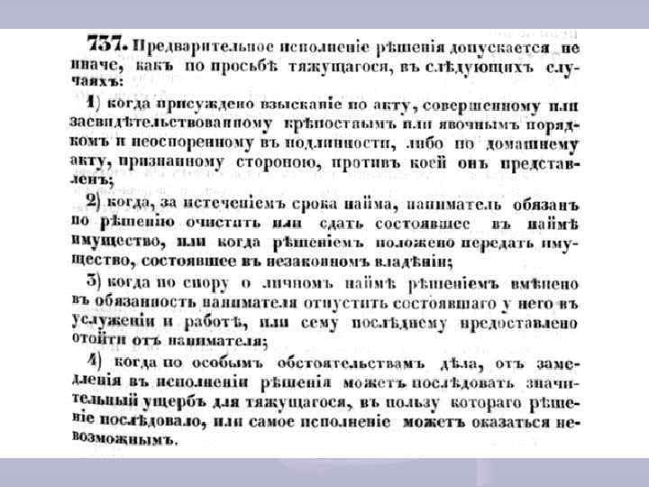 ПРЕДВОРИТЕЛЬНОЕ ИСПОЛНЕНИЕ РЕШЕНИЙ n n n под предварительным понималось исполнение не вступившего в законную силу решения окружного суда могло быть уничтожено в случае отмены решения окружного суда палатой в ст. 737 устанавливалось, что предварительное исполнение решения допускается не иначе, как по просьбе тяжущегося