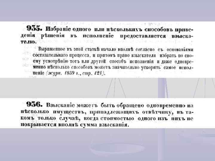 ИСПОЛНЕНИЕ СУДЕБНЫХ РЕШЕНИЙ n n n глава, посвященная исполнению решений Мировых судей (Книга 1) «Об исполнении судебных решений» (Книга 2) действие принципа диспозитивности Ø судебные решения обращались теперь к исполнению по желанию взыскателя