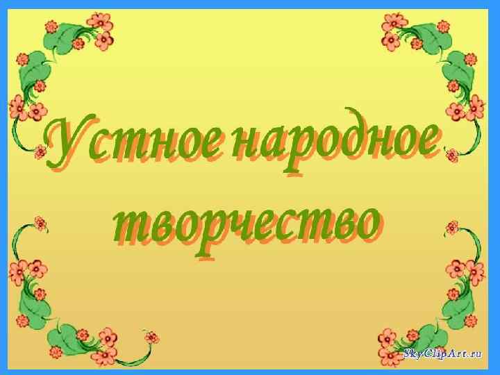 Устное народное творчество. Фольклор • • 1. Русские народные сказки 2. Потешки 3. Скороговорки Фольклор 4. Загадки 5. Былины 6. Песни Закличка народное творчество англ. folk – народ, lore – мудрость, знание совокупность обычаев, обрядов, песен и других явлений народного быта
