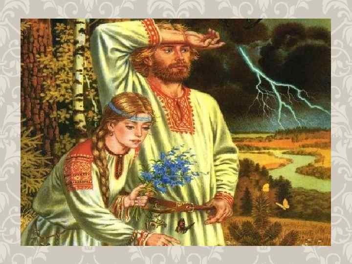 ДРЕВНИЕ СИМВОЛЫ-ОБРАЗЫ § Месяц-отец, муж; солнце-мать, звезды-дети, зорюшка – девушка (жена) § В роли символов выступают птицы (Соловей, селезень, сокол, голубь – молодец; лебедушка, утушка, пава, голубка – девушка; серая кукушка – печаль, горькая женская, девичья доля) § Символы растительного мира (девушка – белая береза, калина, малина, сладкая вишня; молодец – дуб, хмель, виноград) § Символично и состояние растения: цветенье- веселье, увядание – печаль, разлука. § Образные картины помогают создать постоянные эпитеты (буйный ветер, чисто поле, сыра земля, соколик ясный)