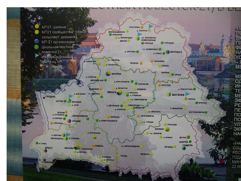 Местные повестки – 21 в Беларуси: первый опыт В Республике Беларусь первопроходцами в области разработки и реализации Местных повесток – 21 стали город Туров и Детский реабилитационно-оздоровительный центр «Надежда», которые начали эту работу в 1999 году. Позже к процессу Местных повесток подключились: Первомайский район города Минска Школа №12 г. Новополоцка Дзержинск Микрорайон «Запад» г. Минска Заславль Дисна Фаниполь Минск Копаткевичи Барань Быховский район Могилев, Россоны, Лепель, Смиловичи, Занарочь, Школьные местные повестки… (всего около 100 инициатив)