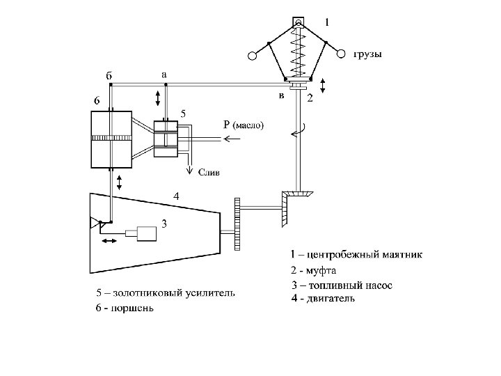 Приведенный выше регулятор работает с определенной статической ошибкой. Чем больше нагрузка, тем больше должен быть ход рейки топливного насоса (в стороны увеличения подачи топлива). Но для этого должно измениться положение муфты регулятора, связанного жестко с рейкой насоса. Новое же положение муфты может быть только при другом числе оборотов, при котором результирующая сила упругости пружины, веса муфты и грузов регулятора будет уравновешивать центробежную силу, возникающую при вращении этих грузов. Новое значение частоты вращения будет меньше старого. Это статический регулятор. Регулятор непрямого действия с гидравлическим усилителем (ГУ). ГУ состоит из золотникового усилителя и поршня. Для усиления используется энергия жидкости под высоким давлением.