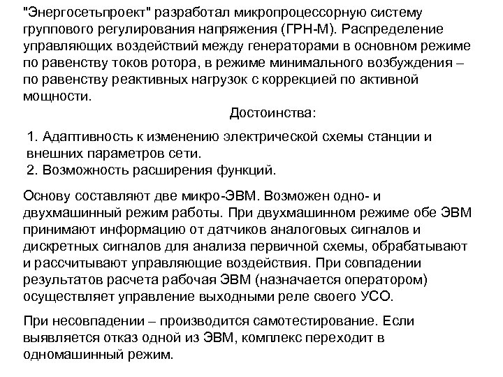 "Энергосетьпроект" разработал микропроцессорную систему группового регулирования напряжения (ГРН-М). Распределение управляющих воздействий между генераторами в основном режиме по равенству токов ротора, в режиме минимального возбуждения – по равенству реактивных нагрузок с коррекцией по активной мощности. Достоинства: 1. Адаптивность к изменению электрической схемы станции и внешних параметров сети. 2. Возможность расширения функций. Основу составляют две микро-ЭВМ. Возможен одно- и двухмашинный режим работы. При двухмашинном режиме обе ЭВМ принимают информацию от датчиков аналоговых сигналов и дискретных сигналов для анализа первичной схемы, обрабатывают и рассчитывают управляющие воздействия. При совпадении результатов расчета рабочая ЭВМ (назначается оператором) осуществляет управление выходными реле своего УСО. При несовпадении – производится самотестирование. Если выявляется отказ одной из ЭВМ, комплекс переходит в одномашинный режим.
