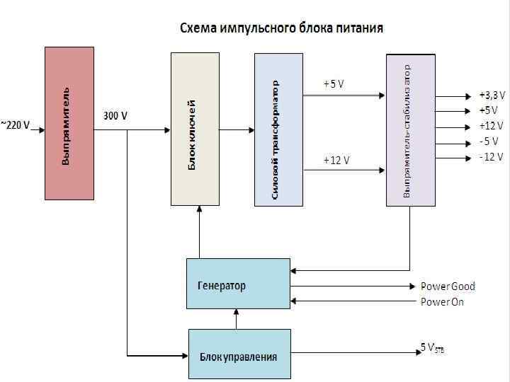 Входной фильтр-выпрямитель Фильтр состоит из индуктивно-емкостных цепей, которые не пропускают сетевые помехи в блок и не дают "выйти" высокочастотным помехам в обратном направлении. Выпрямитель преобразует переменное напряжение сети 220 V в постоянное напряжение 300 V и подает его на блок управления и блок ключей. Блок ключей Состоит из транзисторов, которые управляются (открываются или закрываются) генератором. В результате входное постоянное напряжение преобразуется в последовательность импульсов (отсюда и название "импульсный блок питания"). Генератор Управляющие импульсы генератора открывают транзисторы, в результате чего на первичную обмотку силового трансформатора поступает напряжение. Запитывается генератор с блока управления. По сигналу материнской платы Power On генератор может выключаться (сигналы не будут подаваться на блок ключей, и транзисторы не будут открываться), при этом компьютер переходит в спящий режим. Генератор работает в режиме обратной связи, получая сигналы с выходного блока выпрямителей. В зависимости от этих сигналов генератор регулирует время открытого состояния транзисторов блока управления.