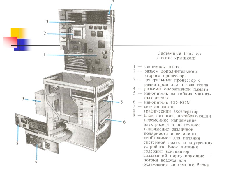 Материнская плата Слот для ОЗУ(ROM) Слот для блока питания Слот для звуковой карты Слот для видеокарты Слот для дисковода для компакт-дисков CD, DVD Слот для дисковода для гибких дисков Слот для винчестера Слот для процессора