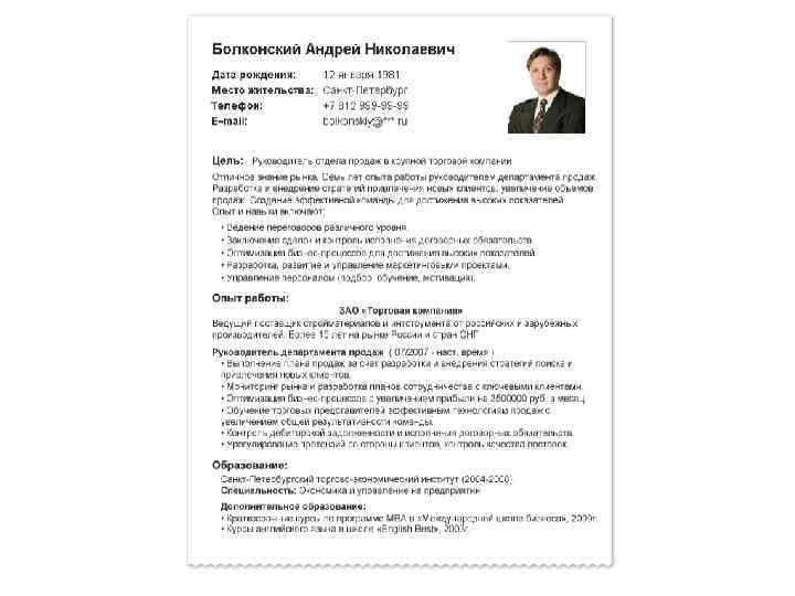 Резюме (структура) Название Цель Контактная информация Полученное образование Трудовой стаж Доп. навыки Доп. Информация Указание возможных рекомендаций Дата составления и подпись