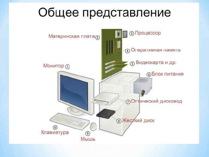 Системный блок – основной блок компьютерной системы. В нем располагаются устройства, считающиеся внутренними. Устройства, подключающиеся к системному блоку снаружи, считаются внешними. В системный блок входит материнская плата, процессор, оперативная память, накопители на жестких и гибких магнитных дисках, на оптический дисках, блок питания и некоторые другие устройства. Корпуса системного блока обычно созданы из деталей на основе стали, алюминия и пластика. По положению корпуса разбиваются на 2 основных класса: * Tower (башня) — вертикальное; * Desktop (на столе) — горизонтальное. 17