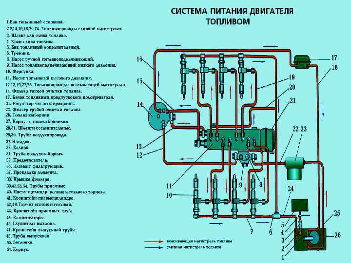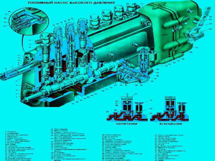 Топливоподкачивающий насос 14 поршневого типа предназначен для бесперебойной подачи топлива из бака к насосу высокого давления. Привод насоса осуществляется от эксцентрика кулачкового валика насоса высокого давления через роликовый толкатель. Корпус насоса отлит из чугуна и крепится тремя шпильками к топливному насосу высокого давления. Ручной насос 2 подкачки топлива служит для заполнения топливом нагнетательной магистрали и удаления из нее воздуха при неработающем двигателе. В нерабочем положении рукоятка насоса ручной подкачки навинчивается на горловину цилиндра насоса. При движении поршня, за счет оттягивания ру коятки, объем над поршневого пространства в цилиндре увеличи вается, и в нем создается разрежение. Под действием разрежения топливо из бака через фильтр грубой очистки поступает к насосу и заполняет освободившийся в цилиндре объем. При об ратном ходе рукоятки топливо из цилиндра выталкивается поршнем и по