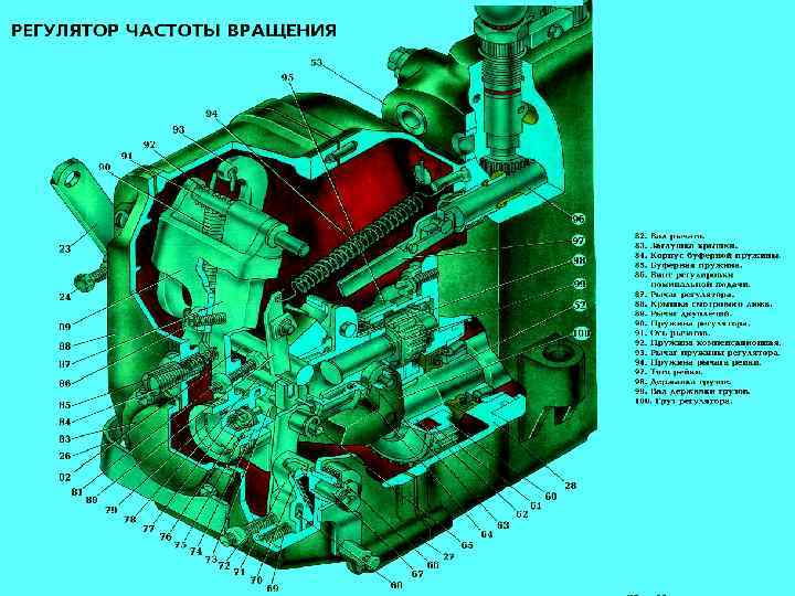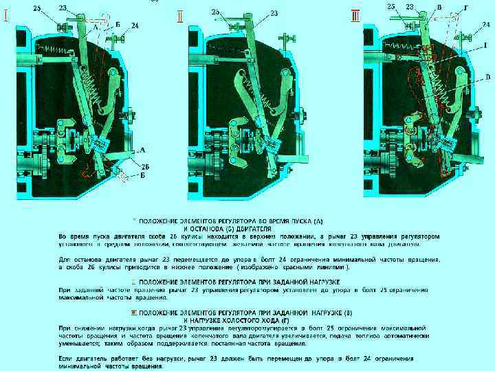 Регулятор частоты вращения коленчатого вала двигателя всережимный, центробежного типа. В условиях меняющейся нагрузки на двигатель он поддерживает частоту враще ния коленчатого вала в определенных пределах. Алюминиевый корпус 3 регулятора установлен на заднем торце насоса высокого давления. В нем установлены все детали регулятора. В процессе работы двигателя регулятор автоматически изменяет подачу топлива и поддерживает заданный скоростной режим работы. В процессе эксплуатации двигателя разрешается регулировать устойчивость его работы на минимальной частоте вращения коленчатого вала. Она может быть отрегулирована болтом и корпусом буферной пружины, которые