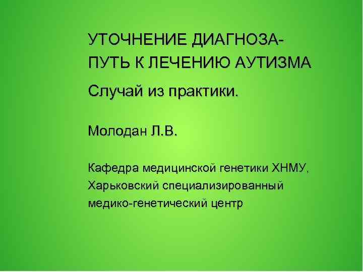 УТОЧНЕНИЕ ДИАГНОЗАПУТЬ К ЛЕЧЕНИЮ АУТИЗМА Случай из практики. Молодан Л. В. Кафедра медицинской генетики ХНМУ, Харьковский специализированный медико-генетический центр