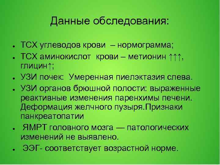 Данные обследования: ● ● ● ТСХ углеводов крови – нормограмма; ТСХ аминокислот крови – метионин ↑↑↑, глицин↑; УЗИ почек: Умеренная пиелэктазия слева. УЗИ органов брюшной полости: выраженные реактивные изменения паренхимы печени. Деформация желчного пузыря. Признаки панкреатопатии ЯМРТ головного мозга — патологических изменений не выявлено. ЭЭГ- соответствует возрастной норме.