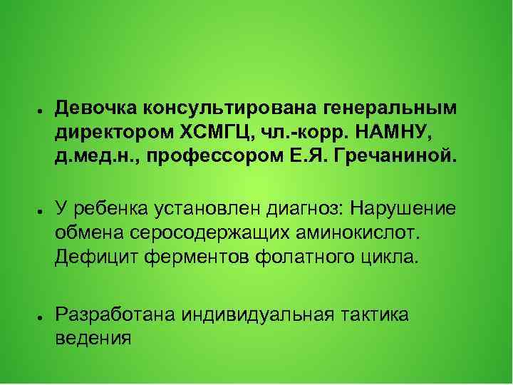 ● ● ● Девочка консультирована генеральным директором ХСМГЦ, чл. -корр. НАМНУ, д. мед. н. , профессором Е. Я. Гречаниной. У ребенка установлен диагноз: Нарушение обмена серосодержащих аминокислот. Дефицит ферментов фолатного цикла. Разработана индивидуальная тактика ведения