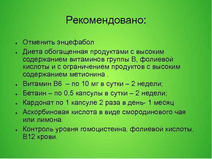 Рекомендовано: ● ● ● ● Отменить энцефабол Диета обогащенная продуктами с высоким содержанием витаминов группы В, фолиевой кислоты и с ограничением продуктов с высоким содержанием метионина. Витамин В 6 – по 10 мг в сутки – 2 недели; Бетаин – по 0, 5 капсулы в сутки – 2 недели; Кардонат по 1 капсуле 2 раза в день- 1 месяц Аскорбиновая кислота в виде смородинового чая или лимона. Контроль уровня гомоцистеина, фолиевой кислоты, В 12 крови.