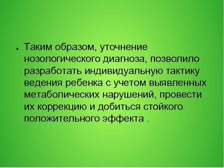 ● Таким образом, уточнение нозологического диагноза, позволило разработать индивидуальную тактику ведения ребенка с учетом выявленных метаболических нарушений, провести их коррекцию и добиться стойкого положительного эффекта.