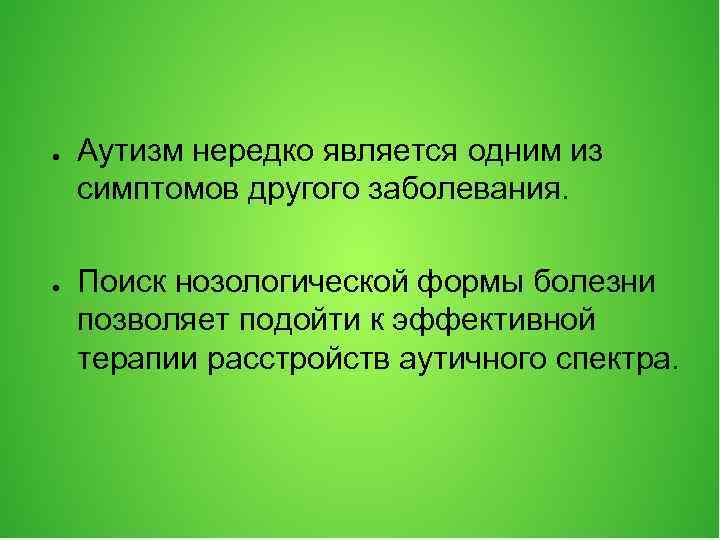 ● ● Аутизм нередко является одним из симптомов другого заболевания. Поиск нозологической формы болезни позволяет подойти к эффективной терапии расстройств аутичного спектра.