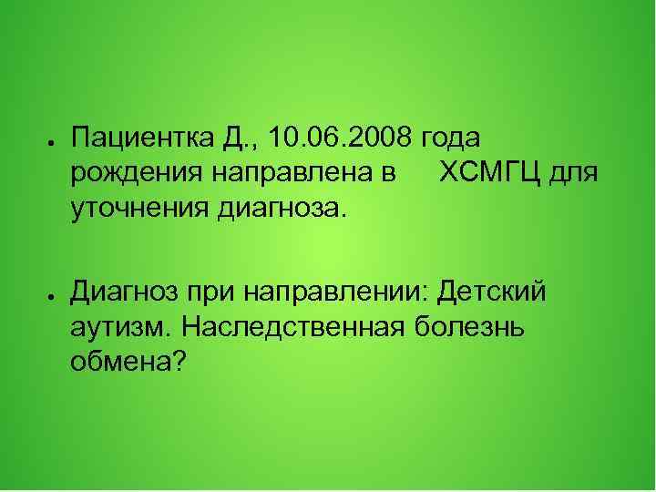 ● ● Пациентка Д. , 10. 06. 2008 года рождения направлена в ХСМГЦ для уточнения диагноза. Диагноз при направлении: Детский аутизм. Наследственная болезнь обмена?