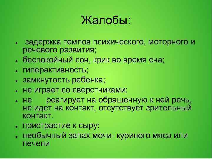 Жалобы: ● ● ● ● задержка темпов психического, моторного и речевого развития; беспокойный сон, крик во время сна; гиперактивность; замкнутость ребенка; не играет со сверстниками; не реагирует на обращенную к ней речь, не идет на контакт, отсутствует зрительный контакт. пристрастие к сыру; необычный запах мочи- куриного мяса или печени