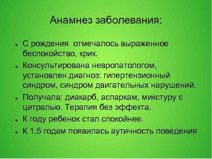 Анамнез заболевания: ● ● ● С рождения отмечалось выраженное беспокойство, крик. Консультирована невропатологом, установлен диагноз: гипертензионный синдром, синдром двигательных нарушений. Получала: диакарб, аспаркам, микстуру с цитралью. Терапия без эффекта. К году ребенок стал спокойнее. К 1, 5 годам появилась аутичность поведения