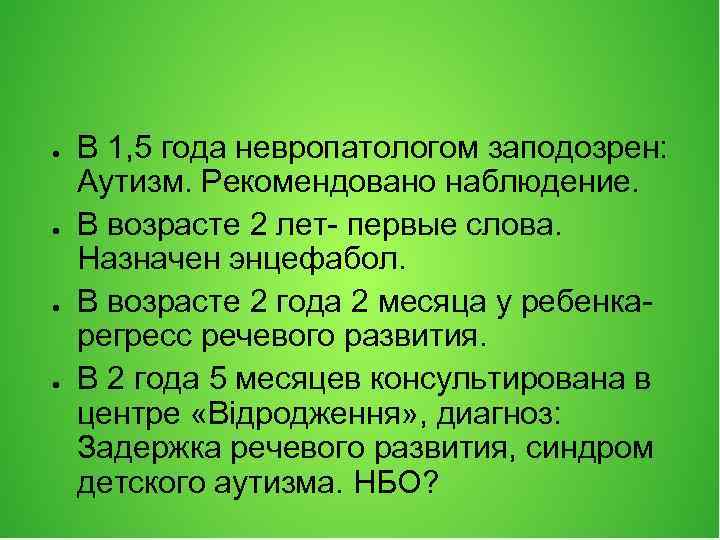 ● ● В 1, 5 года невропатологом заподозрен: Аутизм. Рекомендовано наблюдение. В возрасте 2 лет- первые слова. Назначен энцефабол. В возрасте 2 года 2 месяца у ребенкарегресс речевого развития. В 2 года 5 месяцев консультирована в центре «Відродження» , диагноз: Задержка речевого развития, синдром детского аутизма. НБО?