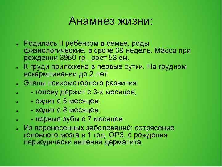 Анамнез жизни: ● ● ● ● Родилась II ребенком в семье, роды физиологические, в сроке 39 недель. Масса при рождении 3950 гр. , рост 53 см. К груди приложена в первые сутки. На грудном вскармливании до 2 лет. Этапы психомоторного развития: - голову держит с 3 -х месяцев; - сидит с 5 месяцев; - ходит с 8 месяцев; - первые зубы с 7 месяцев. Из перенесенных заболеваний: сотрясение головного мозга в 1 год, ОРЗ, с рождения периодически явления дерматита.