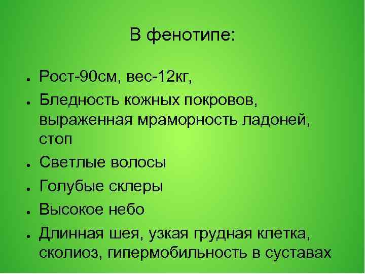 В фенотипе: ● ● ● Рост-90 см, вес-12 кг, Бледность кожных покровов, выраженная мраморность ладоней, стоп Светлые волосы Голубые склеры Высокое небо Длинная шея, узкая грудная клетка, сколиоз, гипермобильность в суставах