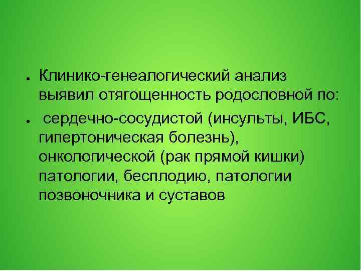 ● ● Клинико-генеалогический анализ выявил отягощенность родословной по: сердечно-сосудистой (инсульты, ИБС, гипертоническая болезнь), онкологической (рак прямой кишки) патологии, бесплодию, патологии позвоночника и суставов