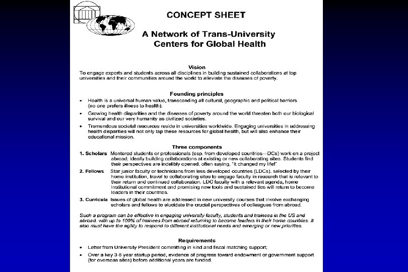 Key Elements in Win-Win Collaborations: Engaging Universities in Global Health • What do universities offer global health? Faculty & students seeking new knowledge; Science and scholarship; Understanding & solutions; Capacity building and collaboration around shared vision. • What does global health offer universities? Opportunities for learning and broadened perspective; Better science and scholarship (research, teaching, service). Tremendous societal resources reside in universities worldwide. Engaging universities in addressing health disparities will not only tap these resources for global health, but will also enhance their research/education/service mission, attracting the best and brightest leaders to build a culture of science and global perspective.